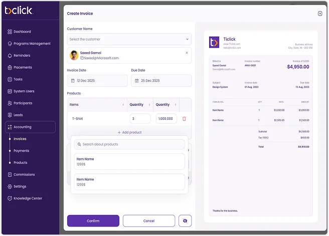 Ticlick’s Accounting & Payments is built to remove confusion from student finances and give every stakeholder a clear, shared view. Instead of scattered invoices, unclear balances, and endless follow-ups, all payments are connected directly to the student profile and program. Invoices, installments, reminders, and reports work together in one system—so finance teams stay accurate, counsellors stay informed, and students always know where they stand.